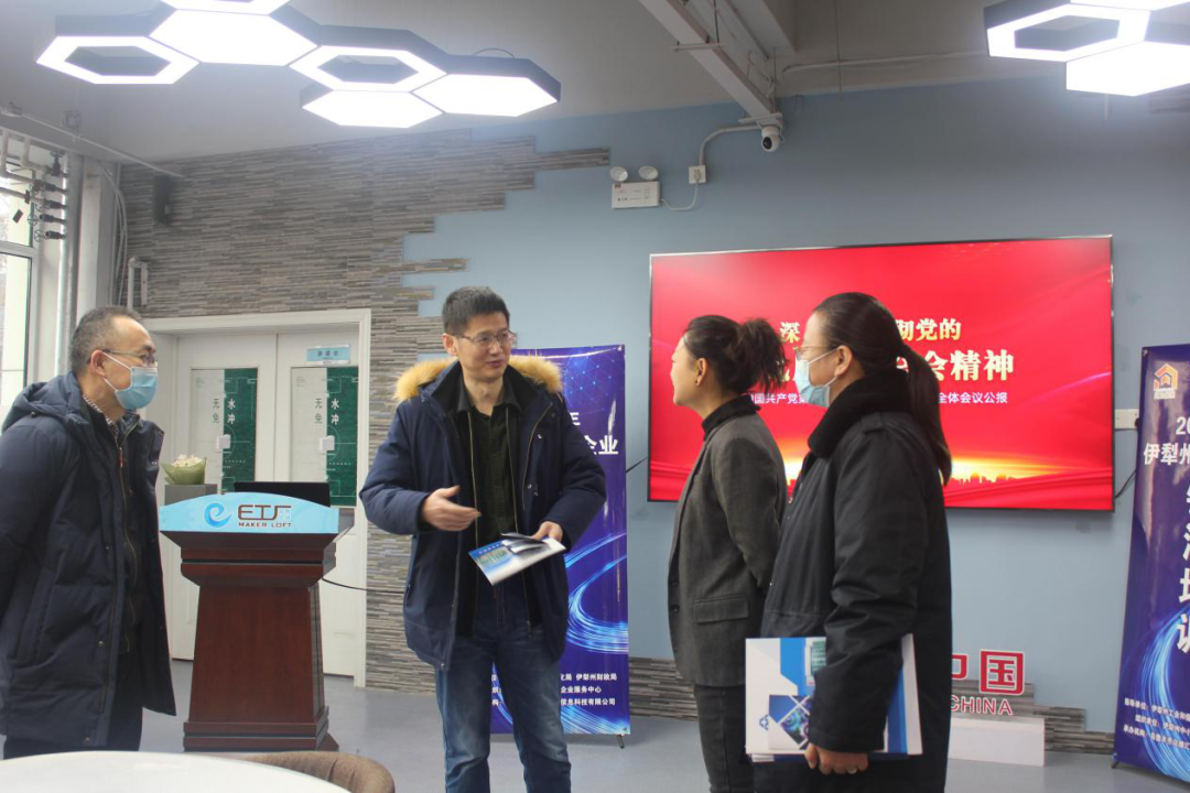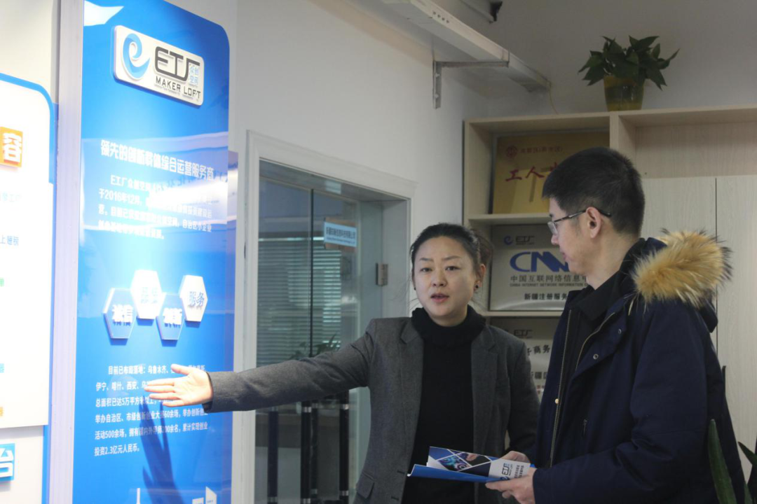 新疆眾維股份運營總監(jiān)曹驥向各位領導介紹了E工廠的發(fā)展歷程及榮獲的相關資質(zhì),陪同其了解E工廠·眾創(chuàng)空間的布局。E工廠·眾創(chuàng)空間于2016年10月投資建設,在“大眾創(chuàng)業(yè)、萬眾創(chuàng)新”的政策引領下,為創(chuàng)業(yè)者提供項目落地、孵化的服務,空間占地面積達1100平方,以虛擬入駐和實體辦公相結(jié)合。截止2021年,入駐企業(yè)累計達500余家,主要以電子商務、軟件開發(fā)、系統(tǒng)集成、新材料、節(jié)能環(huán)保、新媒體運營、文化創(chuàng)意、企業(yè)服務等領域為主。